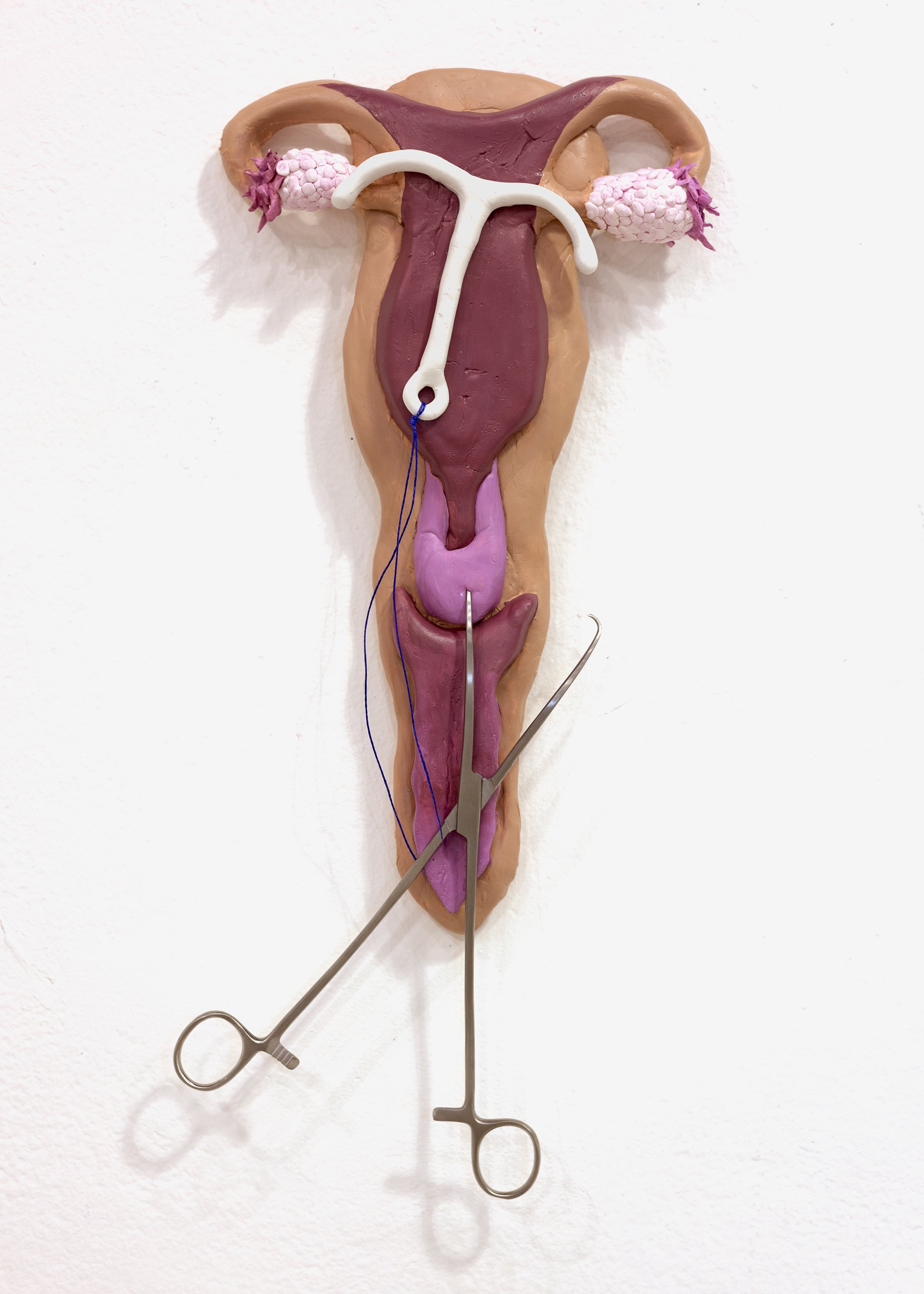 Clay, Aluminum foil, string, glue, tenaculum, acrylic paint