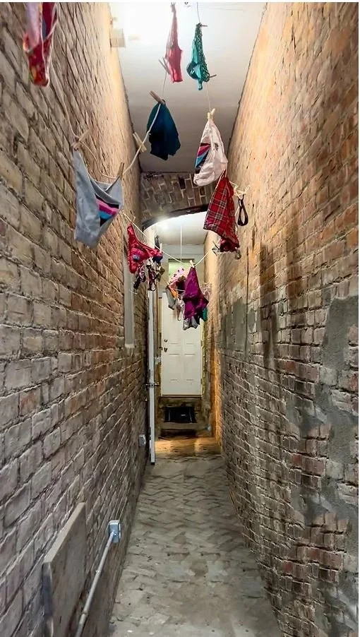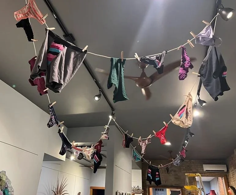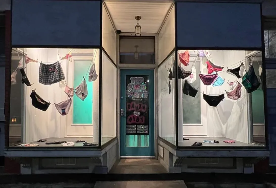 For our Panty Riot installation, we wanted to highlight the history of the Storefront Gallery and its business roots in laundry. The word laundry itself, is such a loaded word, with its own, rather gendered, history and connotations. We chose to focus on the most intimate form of laundry as a way of confronting shameful stereotypes associated with the garments we choose to put on our bodies. The name of both show and installation comes from the antiquated fad of “panty raids” in which men trespassed upon females to steal their underthings, clearly a pseudo sexual conquest. In this work, however, we riot for those who have been raided. We fly our panties, painted with our Box Party sigil, as a way of expressing pride in who we are, celebrating all gender identities and sexualities, and also to signal that this is a safe space; you are welcome, no matter what lies beneath the exterior you choose to show to the world.