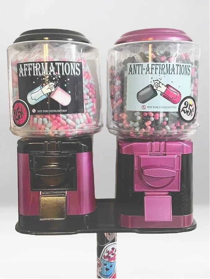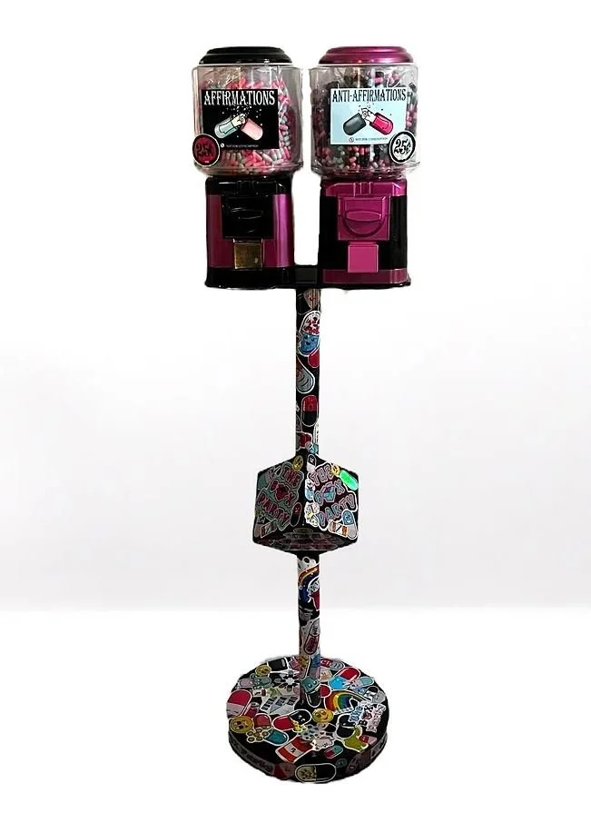 Our Pill Machine questions the societal trend of having a pill for everything. We poke fun at the efficacy of the daily affirmation, offering our own witty, whacky, audacious alternatives. With a punky, tongue-in-cheek aesthetic, we suggest that some prescriptions are not all they seem. And at 25 cents a handful, Big Pharma ain't got nothin' on us.